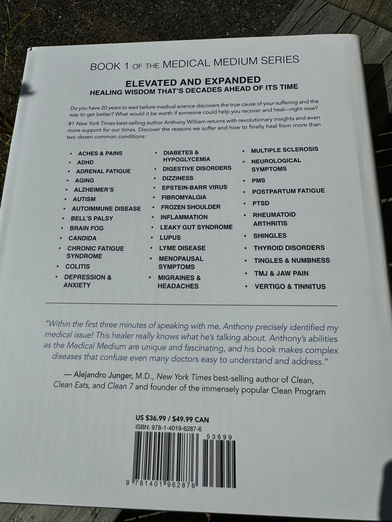 Anthony William, the Medical Medium, has helped millions of people heal from ailments that have been misdiagnosed or ineffectively treated or that doctors can't resolve on their own. Now he returns with an elevated and expanded edition of the book where he first opened the door to healing knowledge from over 30 years of bringing people's lives back. With a massive amount of healing information that science won't discover for decades, Anthony gets to the root of people's pain or illness and what they need to do to restore their health now--which has never been more important. His tools and protocols achieve spectacular results, even for those who have spent years and many thousands of dollars on all forms of medicine before turning to him. They are the answers to rising from the ashes. Medical Medium reveals the true causes of chronic symptoms, conditions, and diseases that medical communities continue to misunderstand or struggle to understand at all. It explores the solutions for dozens of the illnesses that plague us, including Lyme disease, fibromyalgia, adrenal fatigue, ME/CFS, hormonal imbalances, Hashimoto's disease, MS, RA, depression, neurological conditions, chronic inflammation, autoimmune disease, blood sugar imbalances, colitis and other digestive disorders, and more. This elevated and expanded edition also offers further immune support, brand-new recipes, and even more solutions for restoring the soul and spirit after illness or life events have torn at our emotional fabric. Whether you've been given a diagnosis you don't understand, or you have symptoms you don't know how to heal, or someone you love is sick, or you're a doctor who wants to care for your own patients better, Medical Medium offers the answers you need. It's also a guidebook for everyone seeking the secrets to living longer, healthier lives. Discover the reasons we suffer and how to finally heal from more than two dozen common conditions- ACHES & PAINS ADHD ADRENAL FATIGUE AGING ALZHEIMER'S AUTISM AUTOIMMUNE DISEASE BELL'S PALSY BRAIN FOG CANDIDA CHRONIC FATIGUE SYNDROME COLITIS DEPRESSION & ANXIETY DIABETES & HYPOGLYCEMIA DIGESTIVE DISORDERS DIZZINESS EPSTEIN-BARR VIRUS FIBROMYALGIA FROZEN SHOULDER INFLAMMATION LEAKY GUT SYNDROME LUPUS LYME DISEASE MENOPAUSAL SYMPTOMS MIGRAINES & HEADACHES MULTIPLE SCLEROSIS NEUROLOGICAL SYMPTOMS PMS POSTPARTUM FATIGUE PTSD RHEUMATOID ARTHRITIS SHINGLES THYROID DISORDERS TINGLES & NUMBNESS TMJ & JAW PAIN VERTIGO & TINNITUS "The truth about the world, ourselves, life, purpose--it all comes down to healing," Anthony William writes. "And the truth about healing is now in your hands."