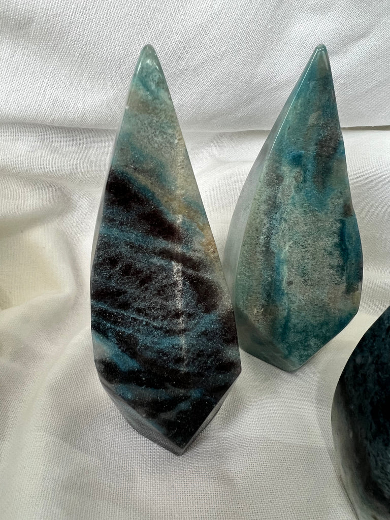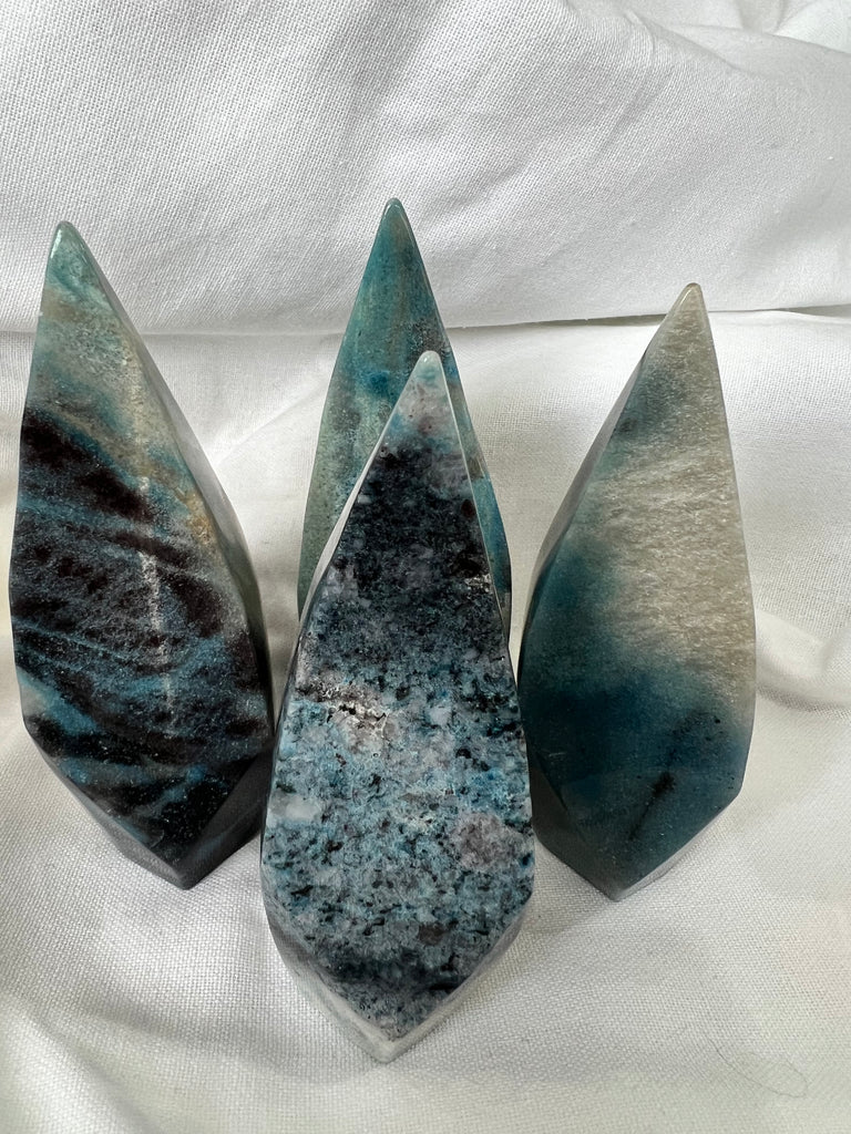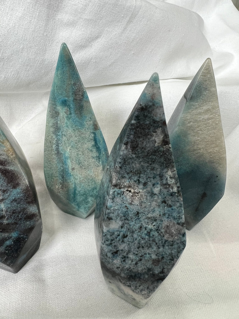 Moving up to the Throat chakra, the presence of Blue Tourmaline enhances communication and self-expression. It helps us speak our truth clearly and honestly, promoting open dialogue and clear understanding in our relationships.