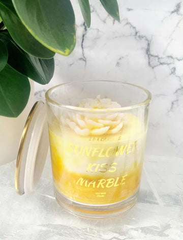 This marbled candle is as enchanting to the eye as it is to the senses, with swirling patterns that echo the bright and delicate fragrance within. The scent opens with a lively burst of luminous lemon and sweet mandarin, softened by juicy peach and refreshing melon. Orange blossom and bergamot add a sunlit sparkle, while a gentle touch of rosewood lingers with floral sophistication.